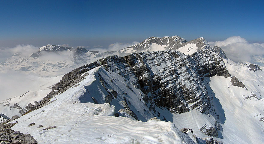 Z vrha v loku: Vrh Laške planje, Mali in Visoki Kanin, Srednji vršič, Hudi vršič.