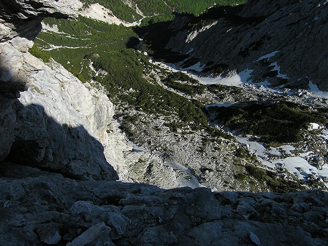 Vrtoglav pogled iz zgornjega kamina prek stene navzdol.