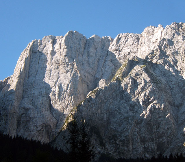 Povečava, Gamsov rob. Na levi navpična stena Koritniškega Malega Mangarta.