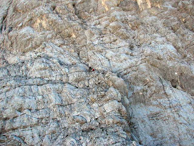 Tole je že 'boljši' pogled: na vrhu terase z dvema rdečima jaknama zagrnjena Marijana in črni Marko.