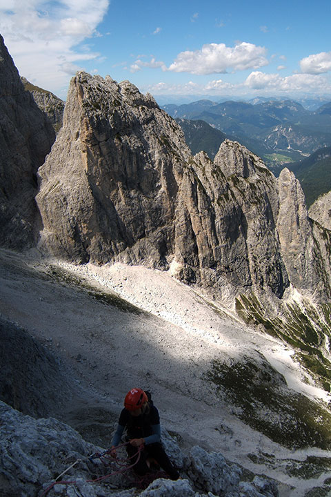 Najbolj udoben, sedeči štant: nad nami še zadnji previsek s skalnatim ušesom, za nami slikovite Lastavice.