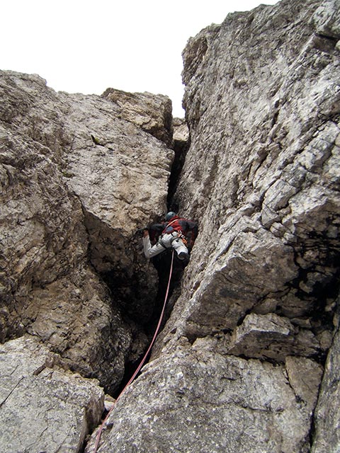 Izstop smeri: po zaguljenem kaminu (po Miheliču globoka poč) na Police bogov. Več kot je bilo Matejevih komentarjev (Luštno!), bolj sva se zavedala, da sva ga 'najebala'. Potem je bilo pa še mnogo huje... ;)