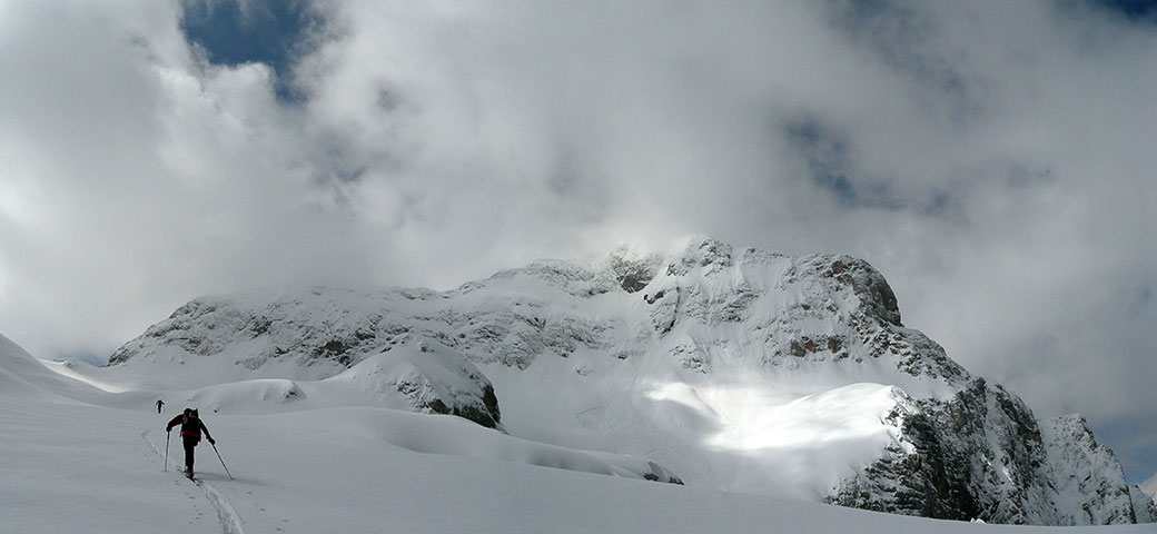 Smučarsko čudovit pogled na povsem zalito vršno steno Triglava.