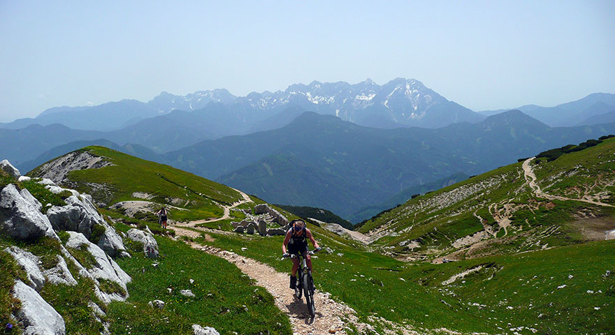 Pod vršno glavico Ojstrca, zadaj Grintovci.