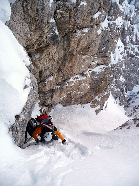 Tik pred škrbino smo odvili naravnost navzgor po vse bolj strmem žlebu.