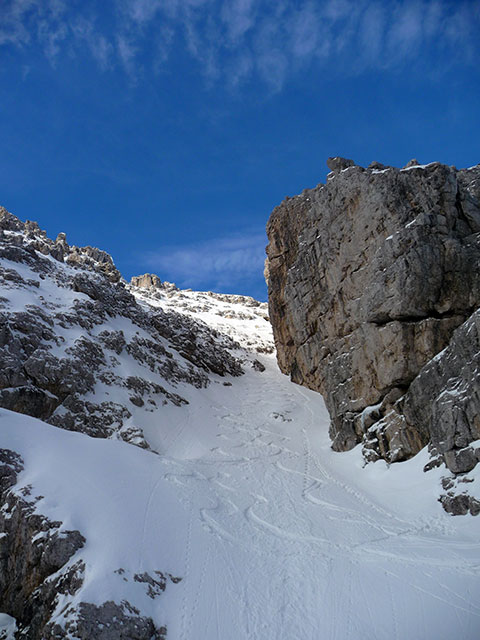 Spodnji del smeri, Z nad Nabojsevo škrbino. Nad zožitvijo smer zavije levo na prostrane vršne vesine.