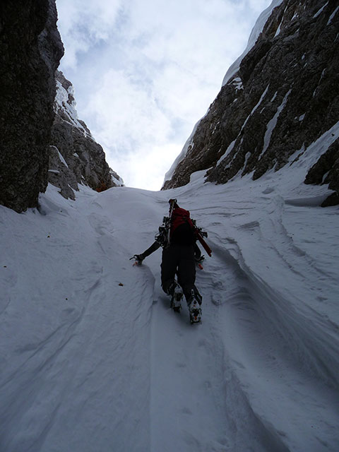 Ključni odsek, kakih 50 m, 50-55°, z dodatkom drče in sredinskega robu.
