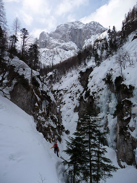 Pravzaprav 'Tumova grapa' pada vse do Rabeljskega jezera. V grapo smo po pobočju z leve vstopili 100 m nad dolino.