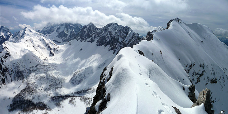Na S predvrhu Volaie, oster greben do glavnega vrha. Zadaj v oblakih najvišji vrh Karnijskih, Coglians.
