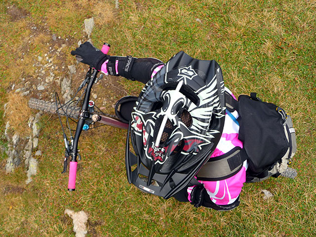 Pikica z barvno usklajenimi gripi in 'ta nevarno' čelado.