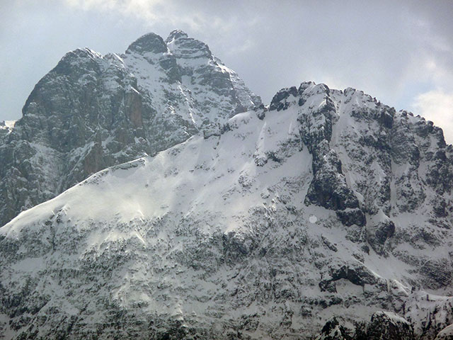 Sumljive snežne razmere in obrat na višini začetka Gamsjih polic, 2000+ m. Levo zgoraj Viš.