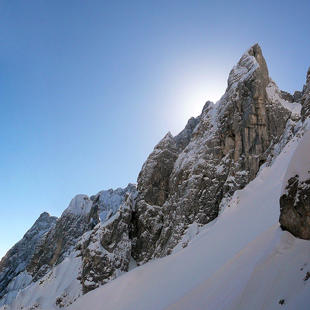 Torre Lazzara, 2263 m. Levo nekaj manjši, zato pa še bolj slikovit Torre Mazzeni, 2212 m.