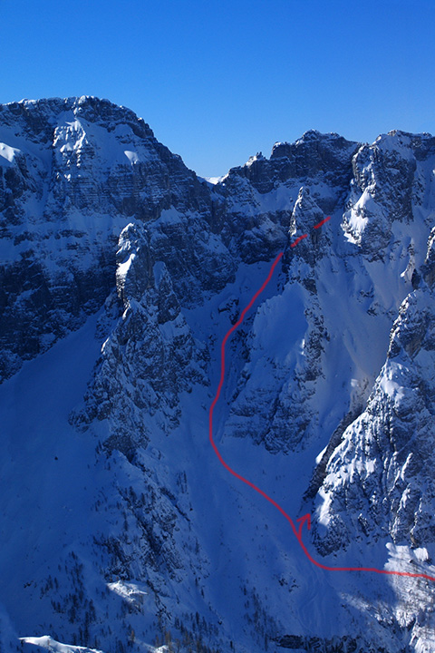 Canalone de lis Sieris med stolpoma Mazzeni in Lazzara. S puščico je označen Žleb Hude police, zaključek spusta je daleč najbolje potegniti s prečnico pod stenami, kjer se za redkim macesnovim gozdom odpre lep prehod v Špranjo. (©bostjan)