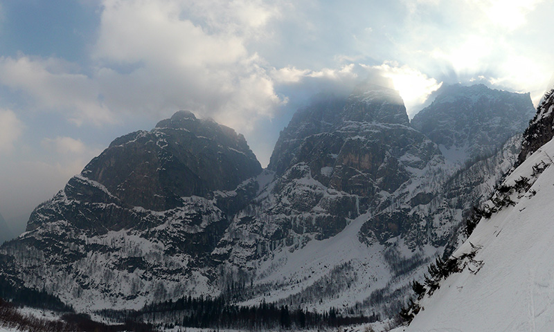Potem smo odkolovratili na to drugo stran Špranje; tokrat oddaljen pogled na Turn nad Zadnjo Špranjo, za njim se skriva Viš, levo Nabojs, desno Koštrunove špice.