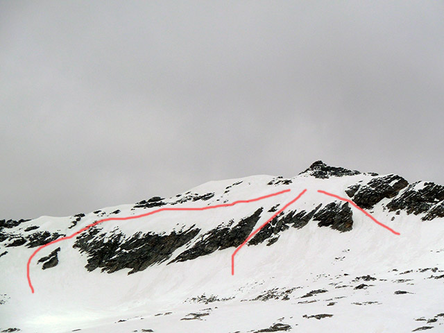 Trije spusti na JZ stran, po vrsti smo jih posmučali z leve proti desni. Najlepši, najbolj zračen in najbolj zahteven je srednji: 45°, 100 m.