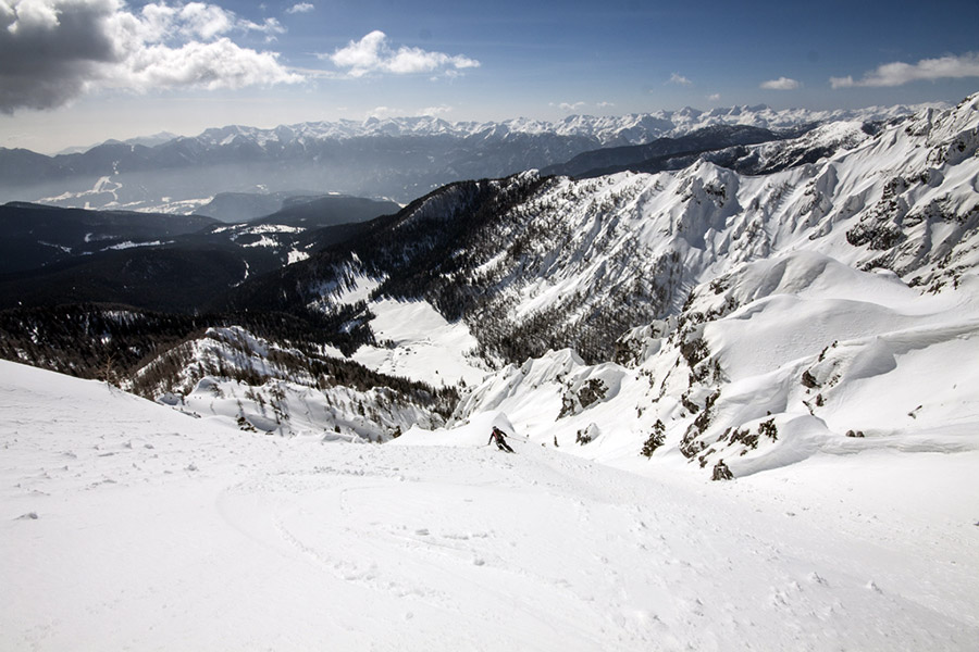 Spust po Desni grapi. Meniva, da je z imenovanjem Osrednje in Desne grape velika zmešnjava. Dejansko je Desna grapa tista, kamor pade vse z vpadnice Viševnika in je dejansko centralna grapa južnega poboča Viševnika. V najini varianti sva bila vseskozi v zavetju pred vršnimi napokami, razen ene prečke in spodnjih par deset metrov grape, kjer sva (pre)močno pospešila. (©jaka) |