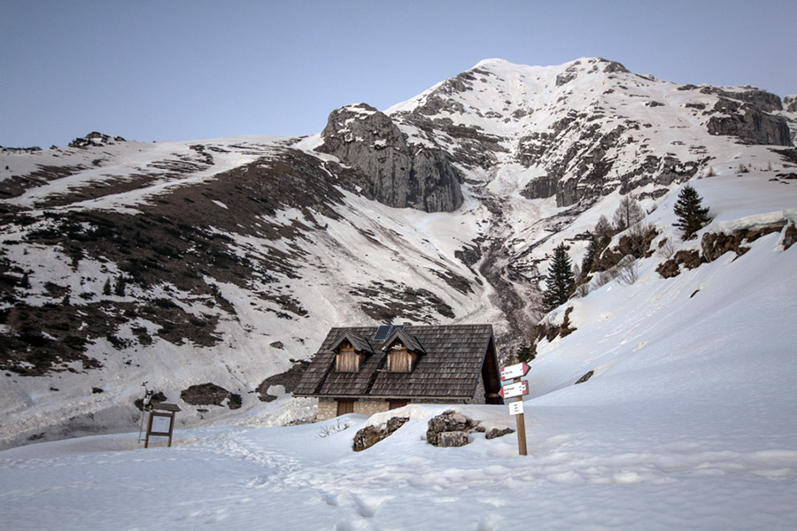Bivak na planini Kanin pod Malim Kaninom. Smer ZJZ obronek poteka zgoraj v vpadnici vrha, zatem prečka v desno in po slemenu do bivaka. (©jaka)
