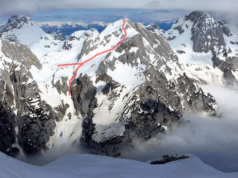 (Leva) Stenarjeva planja. Smučala sva običajni levi iztek; če je zalit, se smuča tudi desnega, ki je bolj strm.