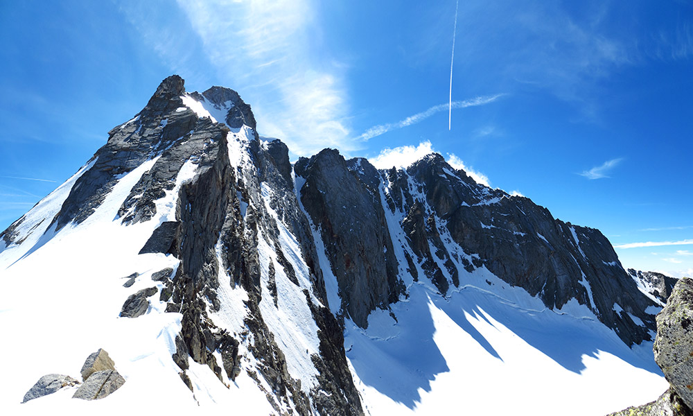 Na vrhu ledenika, na škrbini pod Grosselendkoglom (nekje 3125 m). Pogled na tokrat nič kaj smučarsko užitne zahodne žlebove Hochalmspitze-a.