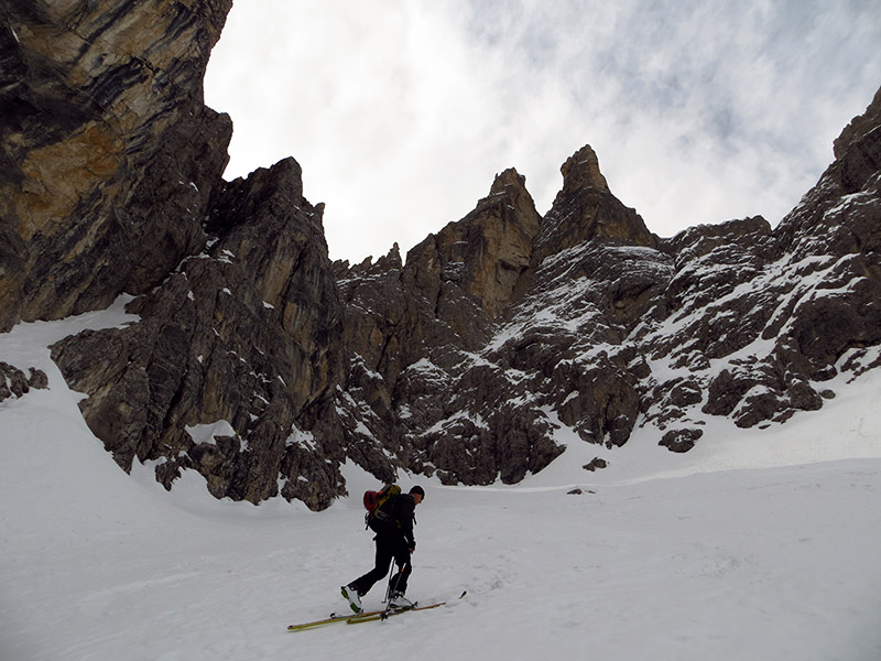 Vstop v žleb označujeta nezgrešljiva stolpa Campanili di Popera.