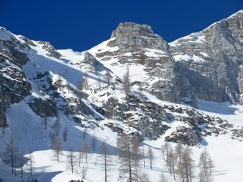 Ključni del ture je prehod na sedlo Scalini. Možne so vsaj tri variante, težavnost narašča od desne proti levi, kjer je pod grebenom slabih 100 m naklon 50° in več.