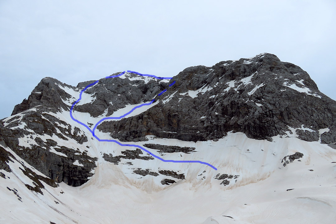 Levo Aerotik, desno Zahodna stena. Vrisan spodnji del je trenutno edina užitna varianta, da se izmaknemo razbiti podlagi v vpadnici.