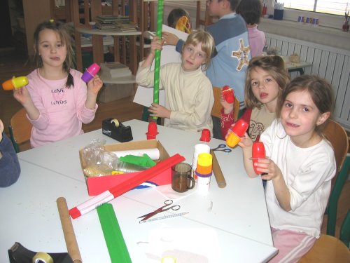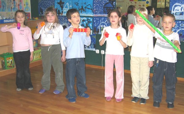 vas prav lepo pozdravljamo. Smo učenci 1.a in 1.b razreda OŠ Prežihovega Voranca iz Raven na Koroškem. Brskali smo po vaši spletni strani in odkrili vaše domiselne instrumente. Tudi sami smo se lotili dela in nastale so DOLGE POJOČE PALICE in MAJHNE PISANE ROPOTULJICE. Petje pesmic je bilo ob spremljavi ropotuljic še bolj zanimivo. V podaljšanem bivanju zmeraj počnemo kaj zanimivega, najraje pa se igramo. Pošiljamo vam dve fotografiji. Kmalu se vam spet oglasimo. Učenci 1. r OPB in učiteljici Janja in Marija |