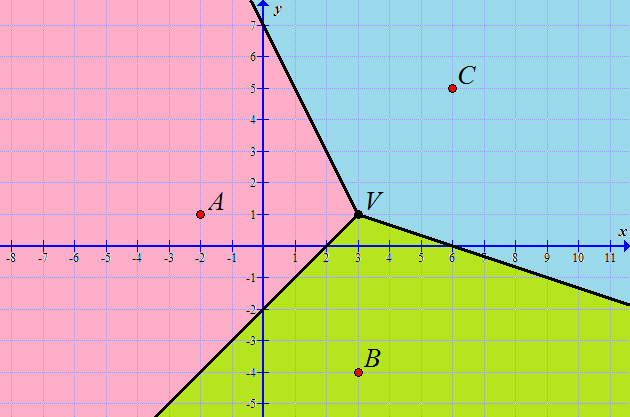 Solutions: (b) \(y=x-2\); (c) \(y=-2x+7\); (d) \(y=-\frac{1}{3}x+2\); (e) \(V(3,1)\); (i) Boundary between red and green follows \(y=x-2~~(\mathrm{for}~x\lt 3)\), boundary between red and blue follows \(y=-2x+7~~(\mathrm{for}~x\lt 3)\), boundary between blue and green follows \(y=-\frac{1}{3}x+2~~(\mathrm{for}~x\gt 3)\)