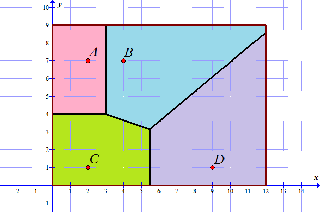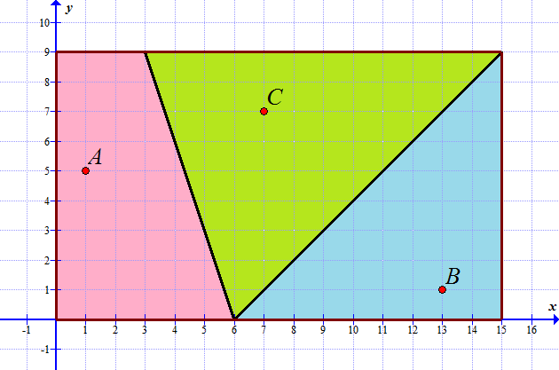 A new shopping centre has opened at \(C(7,7)\). People still go shopping to the nearest shopping centre, so the town is split in three regions now.