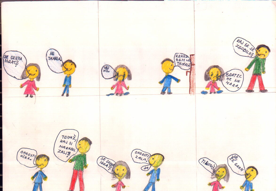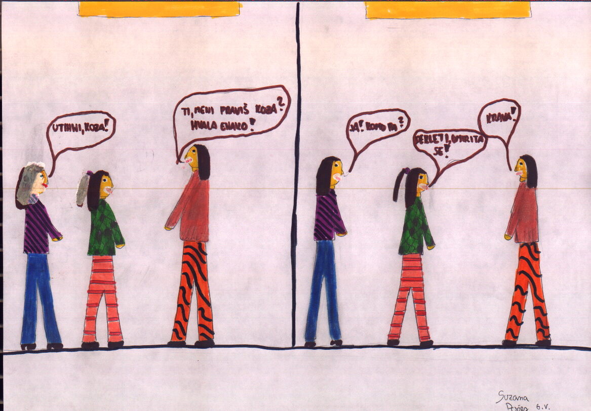 Sara: Veš, saj si imela kar prav, da si nadrla Dušana. Zdi pa se mi, da tovarišica ni ravnala prav, ker je samo tebe poslala ven. Saj je Dušan, ko si ti odšla ven, čisto ponorel!