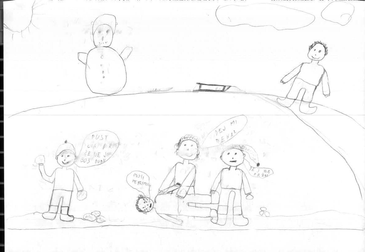 Tistega dne mi je vzgojiteljica rekla, da bomo izdelovali snežinke. Bližalo se je novo leto in treba je bilo okrasiti igralnico. Razdelili smo se po skupinah. Za vsako mizo smo sedeli štirje otroci. Dobili smo material za izdelovanje snežink. Vsaka skupina je dobila papir in kozarec, s katerim smo narisali kroge. Na vsako mizo pa je postavila še kozarček s svinčniki in škarjami. Problem pa je nastal, ker je bil kozarec samo eden, mi pa smo bili štirje. Prvi sem vzel kozarec in začel z njegovim obrisom. Ko sem krog že na pol narisal, mi je tisti, ki je sedel poleg mene, vzel kozarec iz rok. Hotel sem ga vzeti nazaj, pa me je udaril. Začel sem jokati in poklical sem vzgojiteljico. Povedal sem ji, kaj mi je storil. Vzgojiteljica ga je okregala, mu vzela kozarec iz rok in mi ga vrnila. Njemu pa je rekla, naj se mi opraviči.