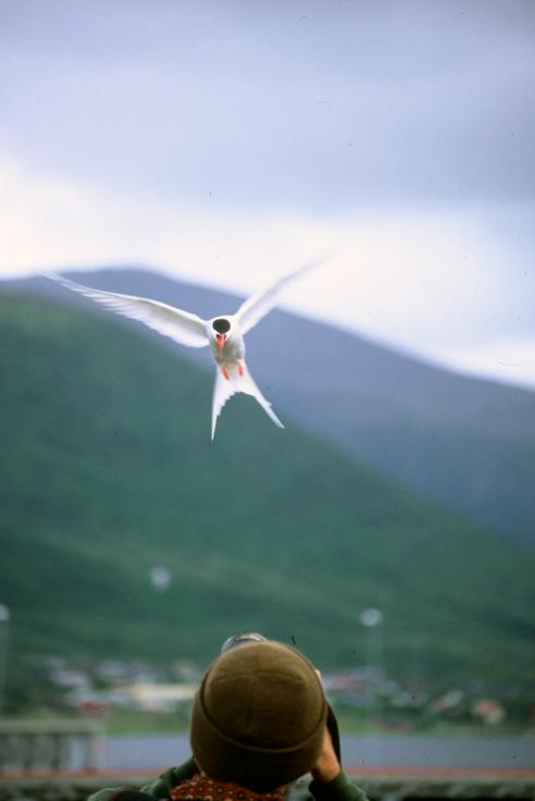 Prijatelj skuša fotografirati arktično čigro, ki ga skuša odgnati iz bližine