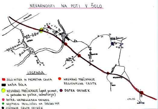 | Učenci krtinske šole moramo biti na svoji poti v šolo zelo previdni. Veliko nas prečka zelo hitro in prometno regionalno cesto. Tudi na poti skozi zgornji del naselja, kjer ni pločnika, moramo biti previdni na oster ovinek in zožanje ceste. Z zemljevidom in fotografijami smo hoteli prikazati najnevarnejša mesta na naši poti v šolo in iz nje. |