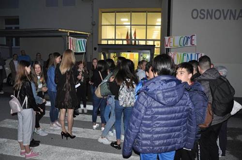 Sobota, 26. 5. 2019, je bil dan, ko so k nam prišli na izmenjavo v okviru projekta Erasmus+ italijanski učenci in učitelji iz šole Istituto Comprensivo di Squillace iz Kalabrije. Prišli so ob 21.00. Ob prihodu smo jih sprejeli s transparenti, jim pripravili kratek kulturni program in jih pogostili s sladicami, ki smo jih učenci in starši pripravili zanje. Ga. ravnateljica, dr. Anja Podlesnik Fetih, jih je pozdravila v angleščini in italijanščini. S pomočjo kratkega filma, ki so ga pred leti posneli učenci turističnega krožka, smo jim pokazali našo občino. Nato smo slovenski učenci, ki sodelujemo v projektu, odšli vsak po enega italijanskega prijatelja in ga odpeljali s sabo domov.