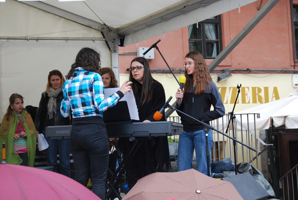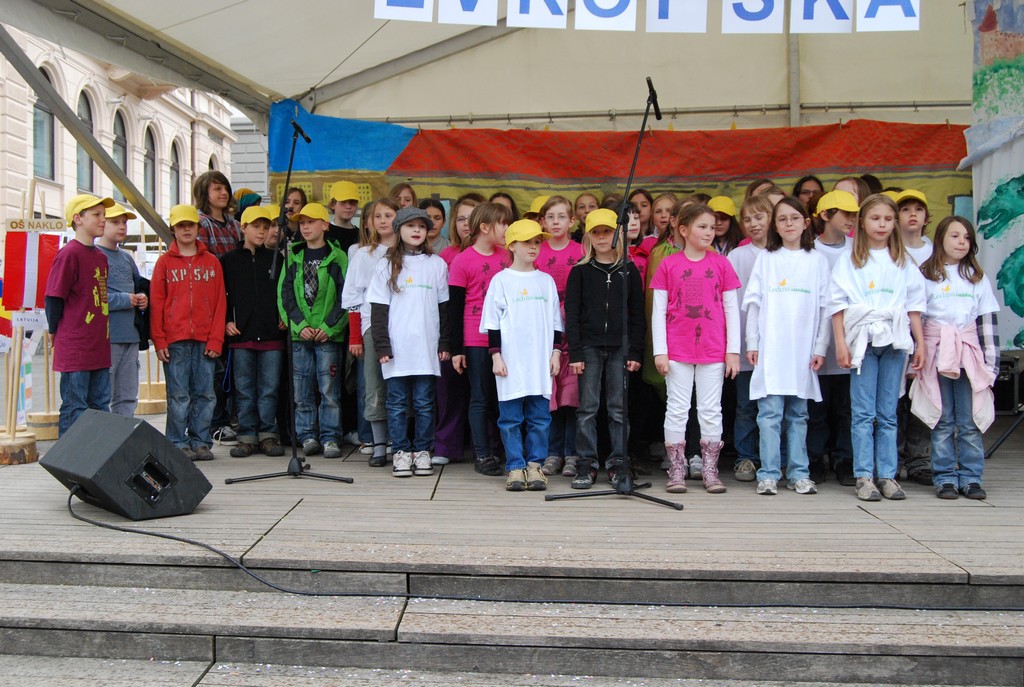 presenečenje. Pevski zbor OŠ Ledina je ravno na mostu pel