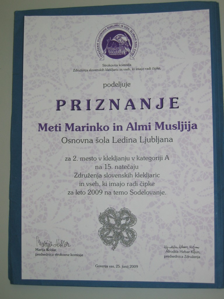 sta izdelali čipko z naslovom: »ZNAK ŠOLE LEDINA«,