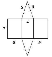 - Tristrana pokončna prizma, ki je visoka 9 cm, ima osnovne robove 4 cm, 5 cm in 7 cm. Njen plašč je pravokotnik z dolžino