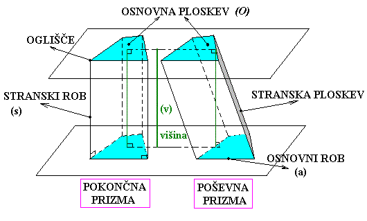 PRIZMA je geometrijsko telo, ki ga omejujeta dva vzporedna in skladna n-kotnika (to sta osnovni ploskvi) in n paralelogramov (to je plašč prizme).
