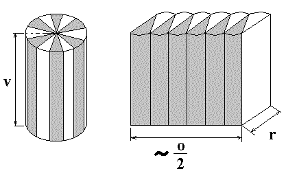 Valj razrežemo na enake dele, ki jih sestavimo v telo, podobno kvadru:![]()