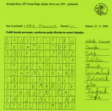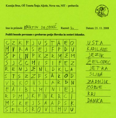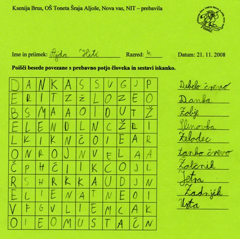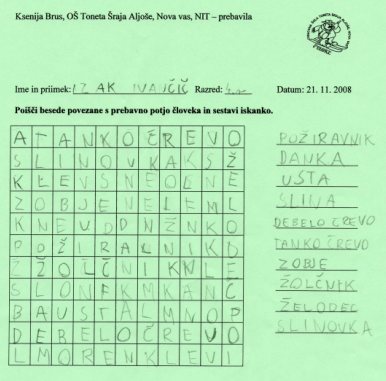 http://www.uciteljska.net/kvizi/HotPot/naravoslovje/telo/prebavaC.htm skupaj z učenci frontalno rešili prvo nalogo. Prebrali smo besedilo o prebavni poti in ga dopolnili s predlaganimi pravilnimi rešitvami. Nato so učenci v dvojicah rešili drugo nalogo, kjer so morali povezati besedo z ustrezno sliko in še tretjo nalogo, kjer so se z reševanjem kviza preizkusili v poznavanju prebavnih organov.Na koncu so morali učenci izdelati iskanko (učni list je v prilogi) z besedami povezanimi s prebavili, ki smo jih na začetku ure zapisali na tablo.
