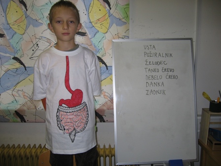 Po obravnavi snovi o prebavilih, ki je potekala eno uro, smo odšli v računalniško učilnico, kjer smo ob prebavni poti naslikani na majici, ki jo je oblekel eden izmed učencev, ponovili potek prebavne poti in ključne besede zapisali na tablo.