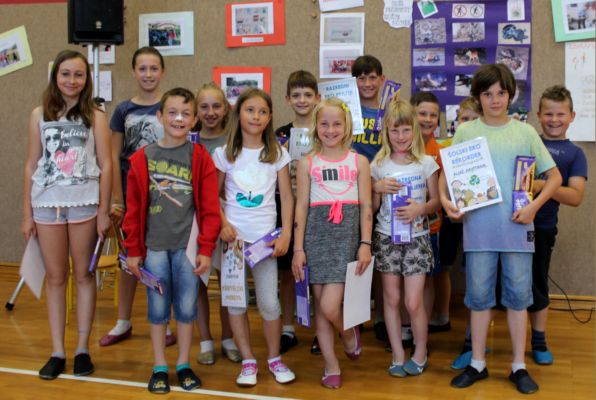 Ponosni nagrajenci s priznanji in velikimi Milka čokoladami.