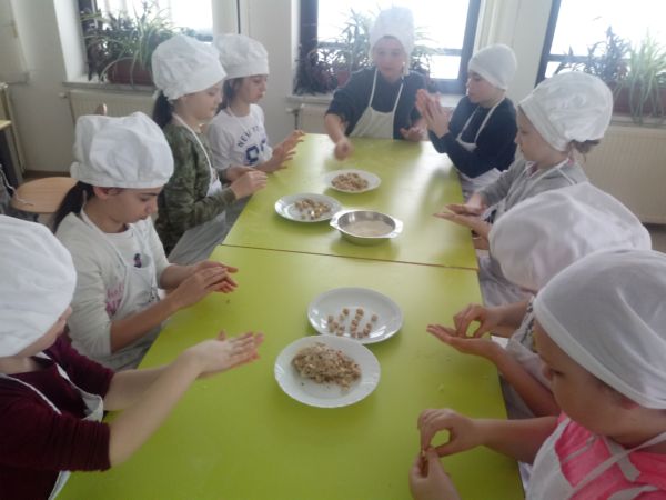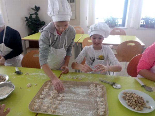 Sneži in močno piha. Še dobro, da dopoldne ni na urniku smučanja. Danes si bomo sami skuhali kosilo in se naučili še nekaj zanimivega. ![]() Delali smo idrijske žlikrofe ... ... in klekljali idrijske čipke. ![]() Nismo se sicer še lotili tistih pravih mojstrovin, je pa začetek zelo obetaven. Vsak si je sklekljal kitico, ki je eden od osnovnih vozlov idrijske čipke. ![]() Smučanje