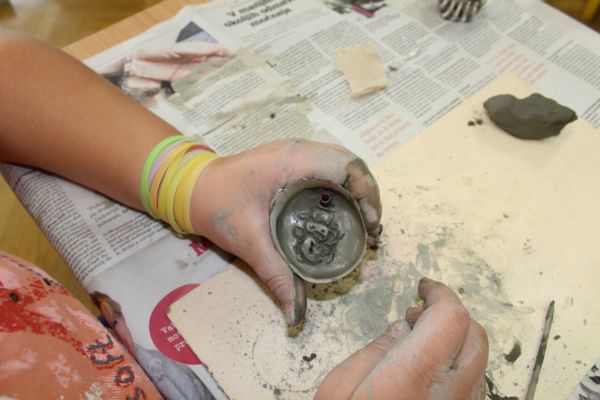 izdelki. Prvošolci in tretješolce so spretno gnetli, lepili, oblikovali