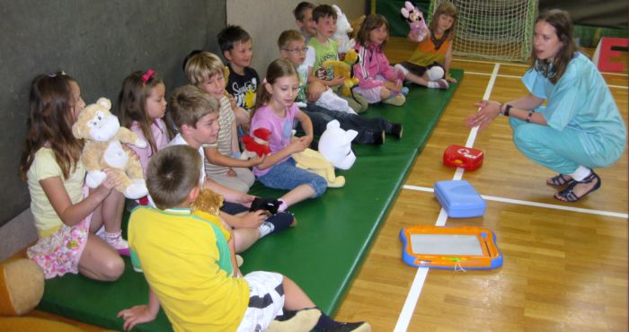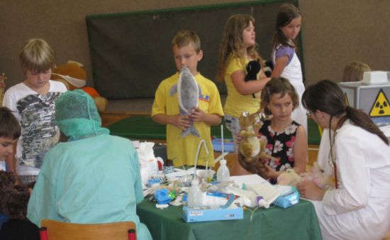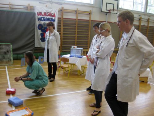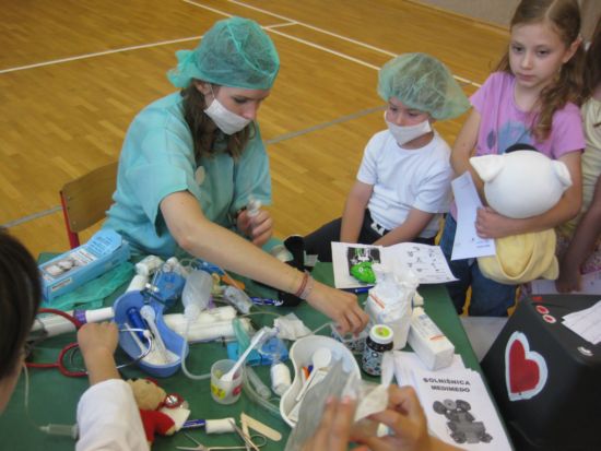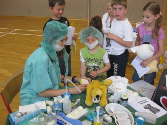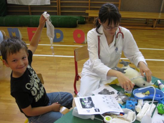 MEDIMEDO Medimedo je prostovoljni, neprofitni projekt, ki deluje pod okriljem Društva študentov medicine Slovenije (DŠMS) in Društva študentov medicine Maribor (DŠMM). Ideja za Projekt Medimedo je nastala pred več leti, ko so nemški študentje medicine opazili, da ima vse več otrok zelo negativen odnos do zdravnikov in zdravstvenega okolja nasploh. Odločili so se, da to pomagajo spremeniti. Glede na to, da je stanje pri nas podobno, so se tudi slovenski študentje medicine novembra 2001 odločili, da po zgledu kolegov iz tujine prvič organizirajo Projekt Medimedo. Tako je nastal projekt, kjer študenje medicine mlajšim otrokom predstavijo delo zdravnika na prijazen način. Zbolijo njihove igrače, ki jih nato skupaj pozdravijo. Otrokom se tako ni treba bati, da bi bili sami pregledani in lahko sproščeno sodelujejo pri igri. Ob tem je glavno vodilo, da se otroke aktivno vključi v sam pregled bolne igrače. Lahko vprašajo, vsega se lahko dotaknejo, poskusijo kako deluje stetoskop, merilec tlaka, kakšni so osnovni pripomočki, ki jih pri delu uporablja zobozdravnik ... Z namenom, da bi bil projekt kar se da kvaliteten in zanimiv, so k sodelovanju pritegnili še študente dentalne medicine, farmacije in psihologije. Medimedo je mednarodni projekt, z imenom Teddy Bear Hospital, ki ga študentje medicine izvajajo v več kot 20 državah po vsem svetu. S pomočjo mame našega učenca nam je uspelo, da projekt pripeljemo tudi na našo šolo. Učenci prve triade so preživeli zanimivo in poučno uro. |
