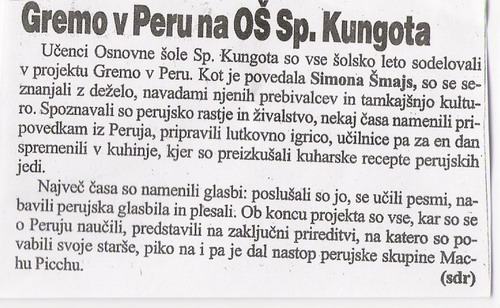 Naloga je prinesla veliko zemljevidov, podatkov o državi, zanimivosti…… a najlepše je bilo, ko sta nas obiskala Sandro in Nataša, ki sta nam prinesla veliko predmetov iz Peruja in nam povedala veliko zanimivega o tej  deželi.