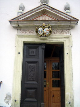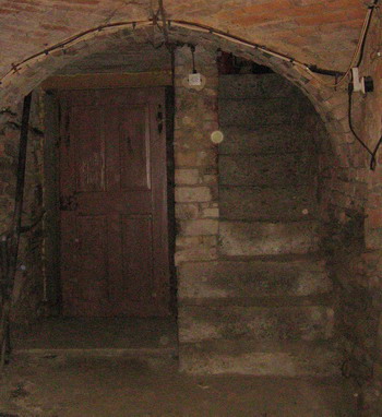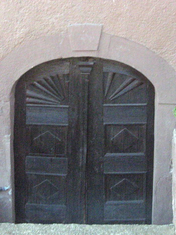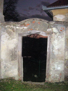Kamnit, potlačen polkrožni portal s temenskim sklepnikom vodi v klet. Opremljen je z lepo oblikovanimi, ročnoizdelanimi dvokrilnimi vrati.