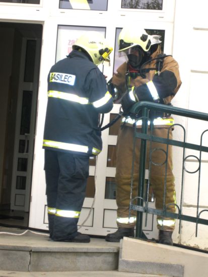 tudi gasilski avto, gasilci so iz šole rešili pet učencev, ki so ostali v