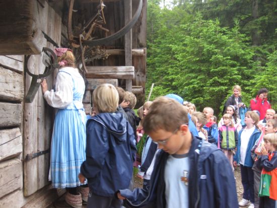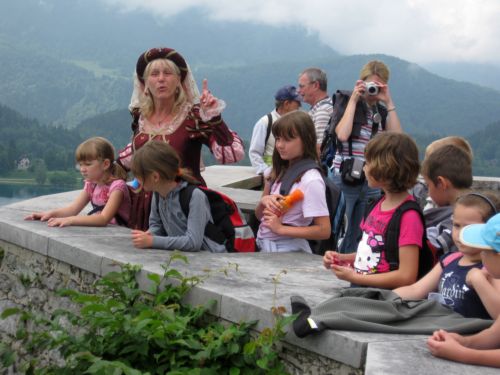 Najprej smo šli na grad na Bledu. Bilo mi je lepo. Deklice smo se morale vesti kot princeske, fantje so bili vitezi. Grof nas je odpeljal v muzej in nam tam razlagal. Grofica nam je obljubila, da bomo šli v kraljevo sobo, pa je pozabila. Bilo je veliko tujih turistov. Zdelo se mi je, da se vsi pogovarjajo o nas. Če bi imela zraven 100 evrov, bi si lahko kupila spominek v tiskarni.