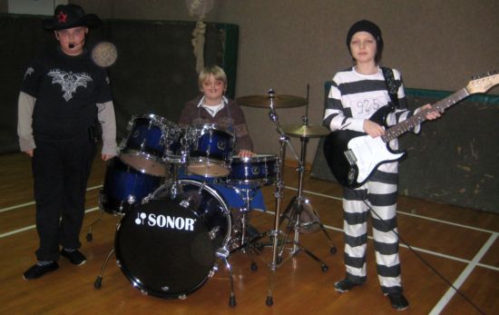 Alen je pel, Aljoša pa je igral na bobne. Najprej smo vadili v razredu. Sošolec